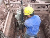 1: 先將水鉆機(jī)放置于要鉆的位置,下面用斜木墊住鋼板,鋼板底部前方左右各一塊,后底部中間位置一塊,方鋼大約與地面呈90度角,頂部放置一塊木方,將頂寸轉(zhuǎn)動(dòng)牢牢頂住木方,水鉆機(jī)不能有任何的擺動(dòng)和晃動(dòng)。